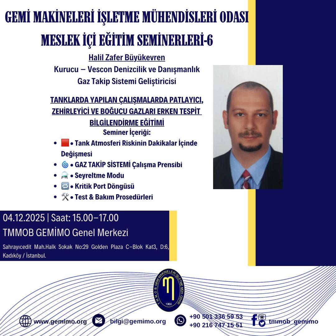 TMMOB GEMİMO Meslekiçi Eğitim Seminerleri kapsamında 04 Aralık 2025 tarihinde Halil Zafer Büyükevren'in sunumu ile gerçekleştirilecek olan "Tanklarda Yapılan Çalışmalarda Patlayıcı, Zehirleyici ve Boğucu Gazları Erken Tespit Bilgilendirme Eğitimi"ne katılım başvurularınızı bilgi@gemimo.org mail adresine gönderebilirsiniz.