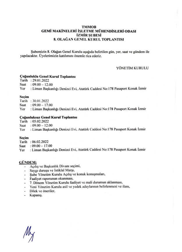 TMMOB GEMİMO İZMİR ŞUBE 8 . OLAĞAN GENEL KURUL TOPLANTISI VE SEÇİM HK