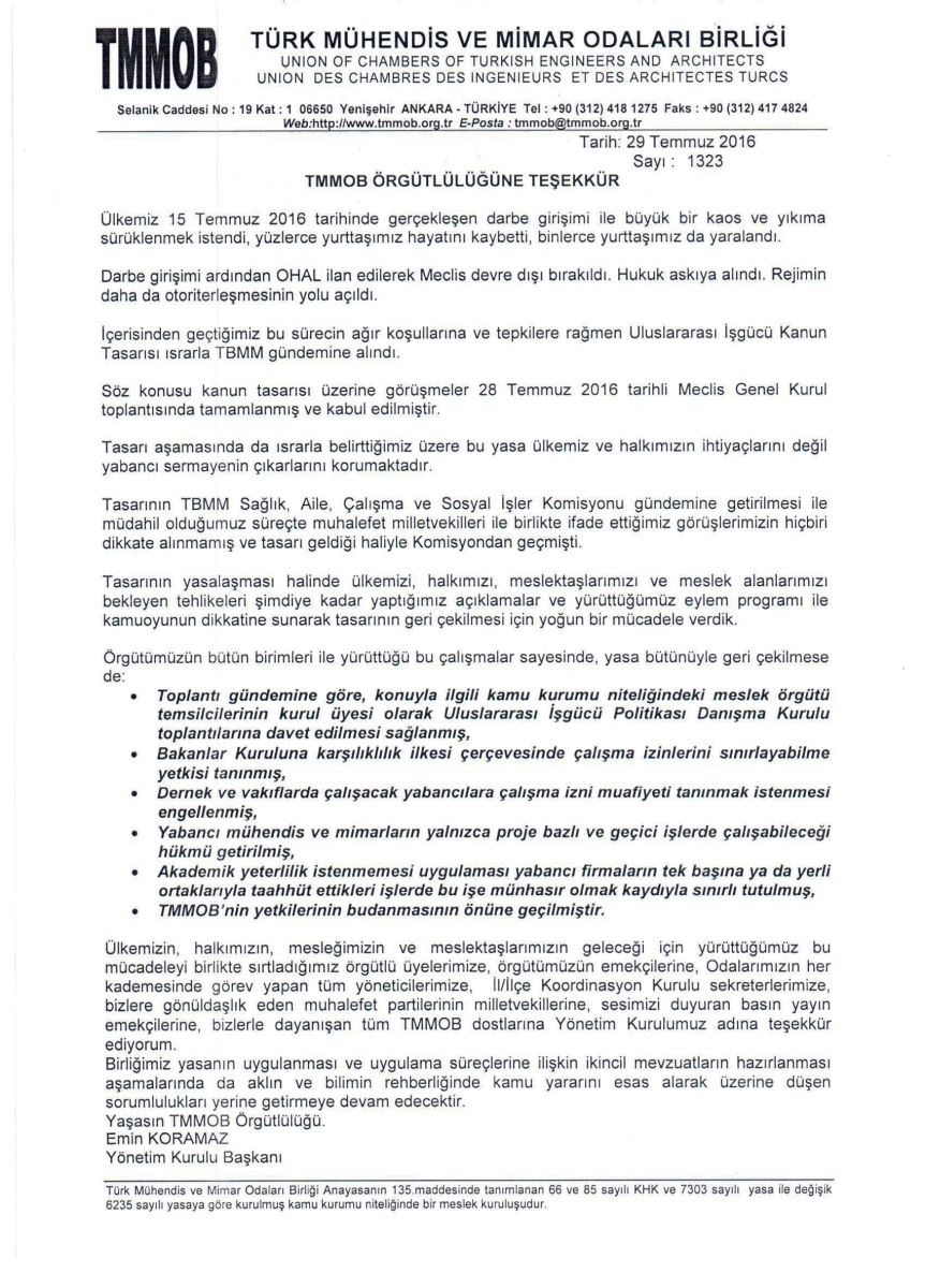 Ülkemizin, halkımızın, mesleğimizin ve meslektaşlarımızın geleceği için yürüttüğümüz bu mücadeleyi birlikte sırtladığımız örgütlü üyelerimize, örgütümüzün emekçilerine, Odalarımızın her kademesinde görev yapan tüm yöneticilerimize, İl/İlçe Koordinasyon Kurulu sekreterlerimize, bizlere gönüldaşlık eden muhalefet partilerinin milletvekillerine, sesimizi duyuran basın yayın emekçilerine, bizlerle dayanışan tüm TMMOB dostlarına Yönetim Kurulumuz adına teşekkür ediyorum.