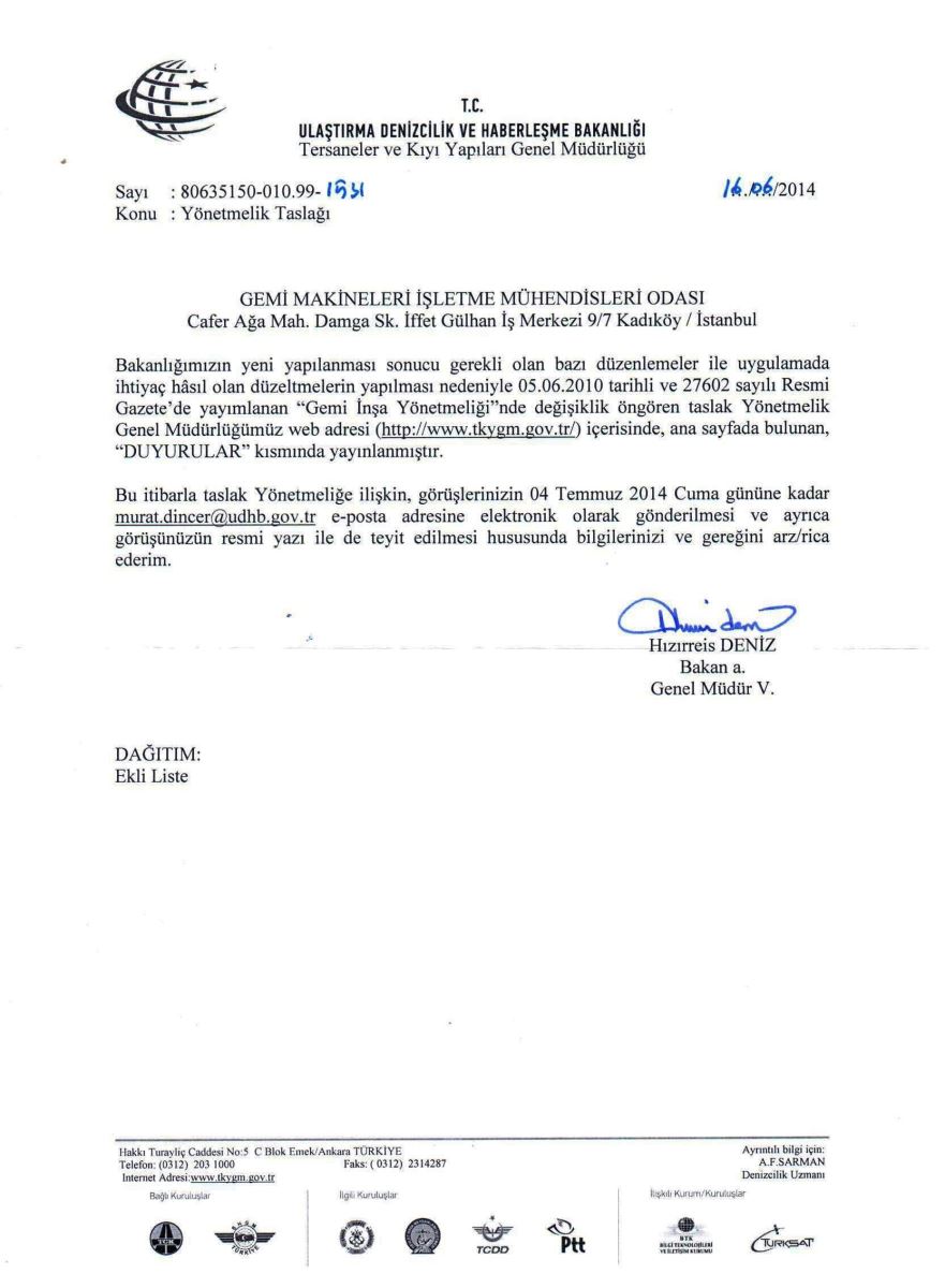 Ulaştırma Denizcilik ve Haberleşme Bakanlığı'ndan gelen yazıya istinaden "Gemi İnşa Yönetmeliğinde Değişiklik " ön gören taslak Yönetmeliğe UDHB Tersaneler ve Kıyı Yapıları Genel Müdürlüğü web sayfasında www.tkygm.gov.tr " duyurular kısmından ulaşabilirsiniz