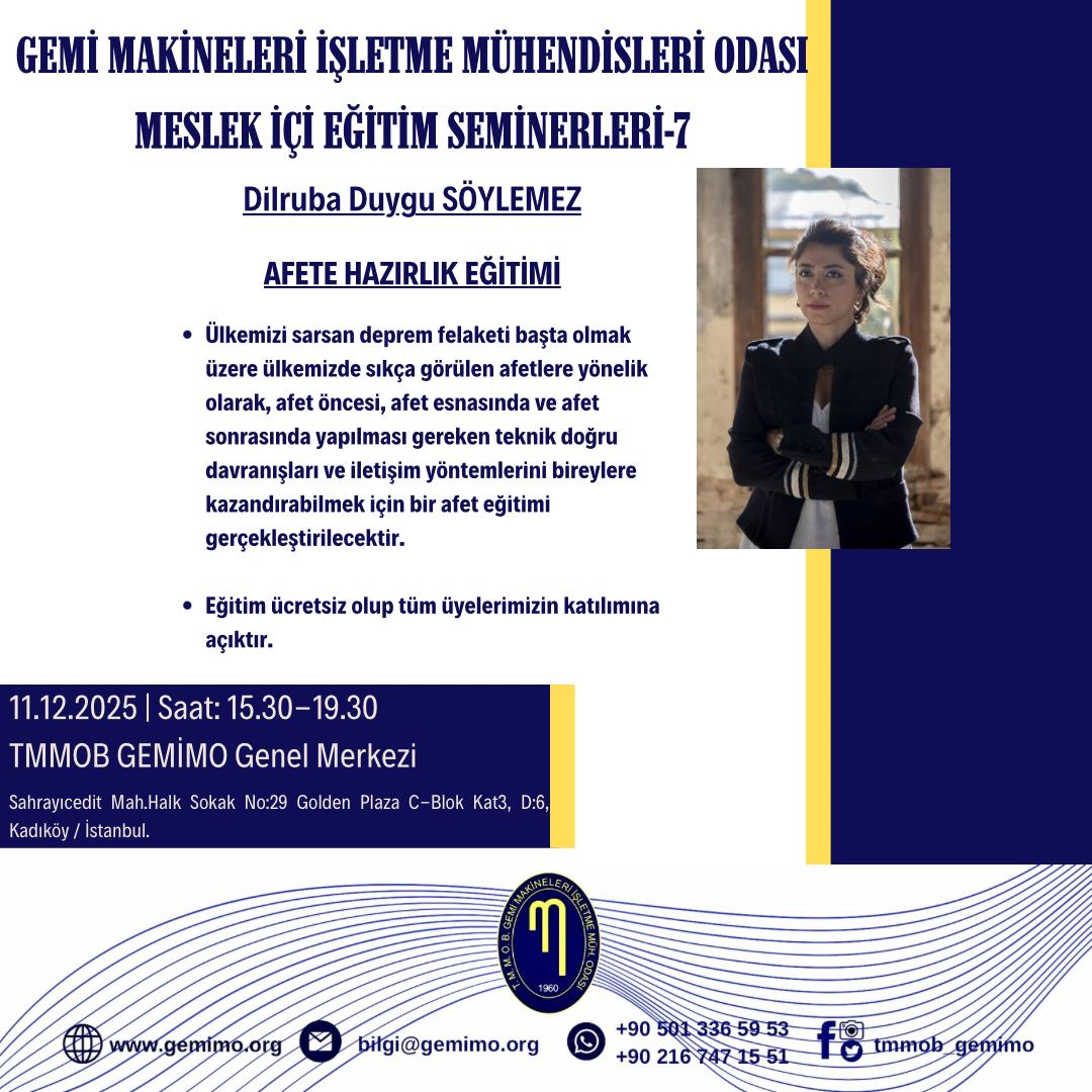 TMMOB GEMİMO Meslekiçi Eğitim Seminerleri kapsamında 11 Aralık 2025 tarihinde (perşembe günü) Sn.Dilruba Duygu SÖYLEMEZ sunumu ile gerçekleştirilecek olan "AFETE HAZIRLIK" eğitimine ne katılım başvurularınızı bilgi@gemimo.org mail adresine gönderebilirsiniz.