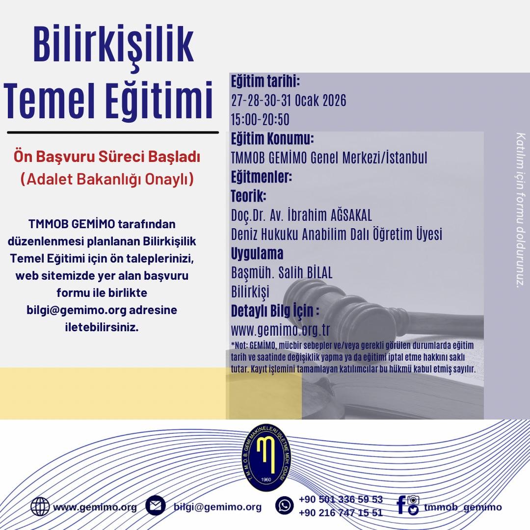TMMOB GEMİMO tarafından 27-28 - 30 - 31 Ocak 2026 tarihinde Bilirkişilik Temel Eğitimi Planlanmıştır.